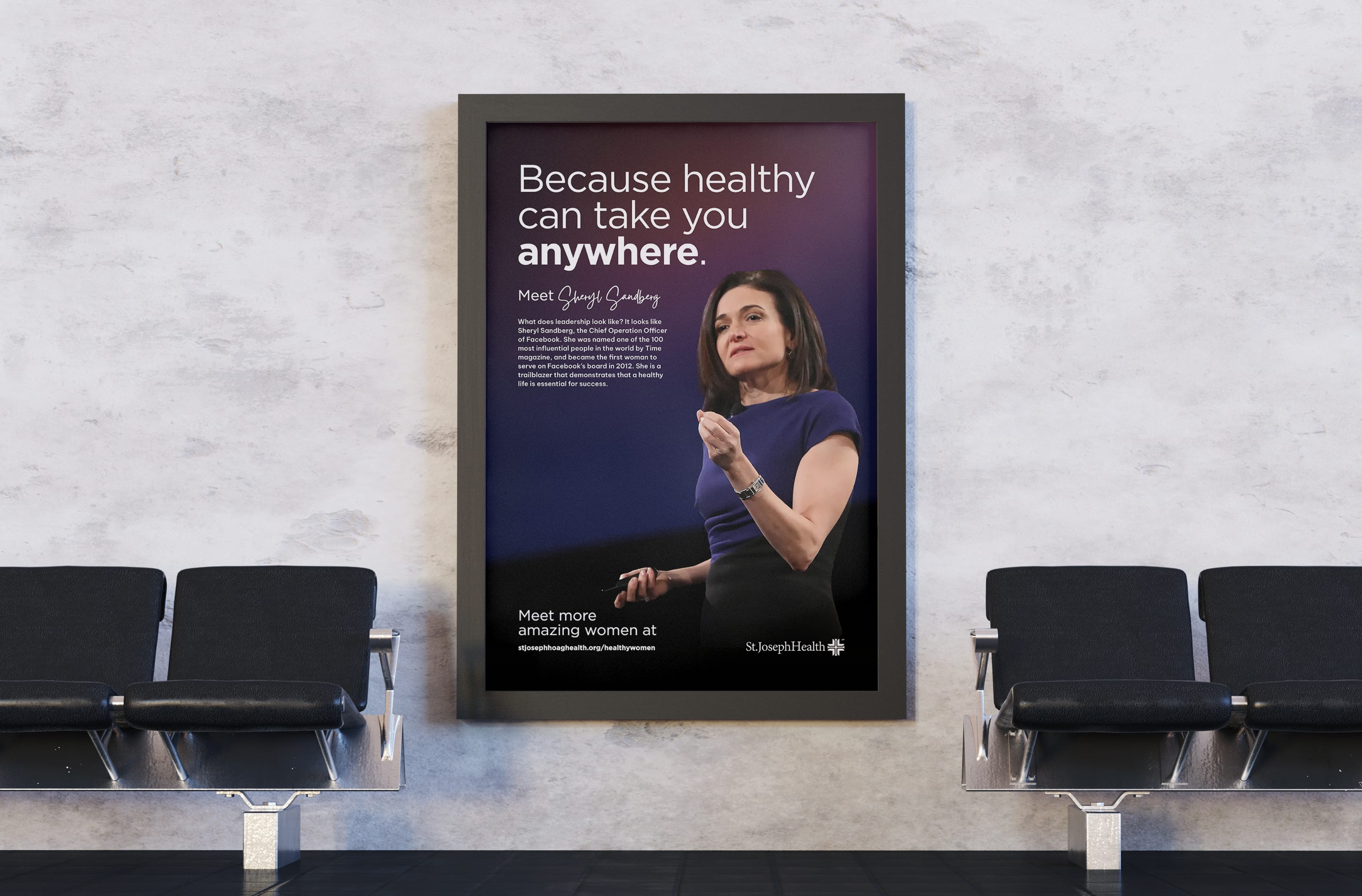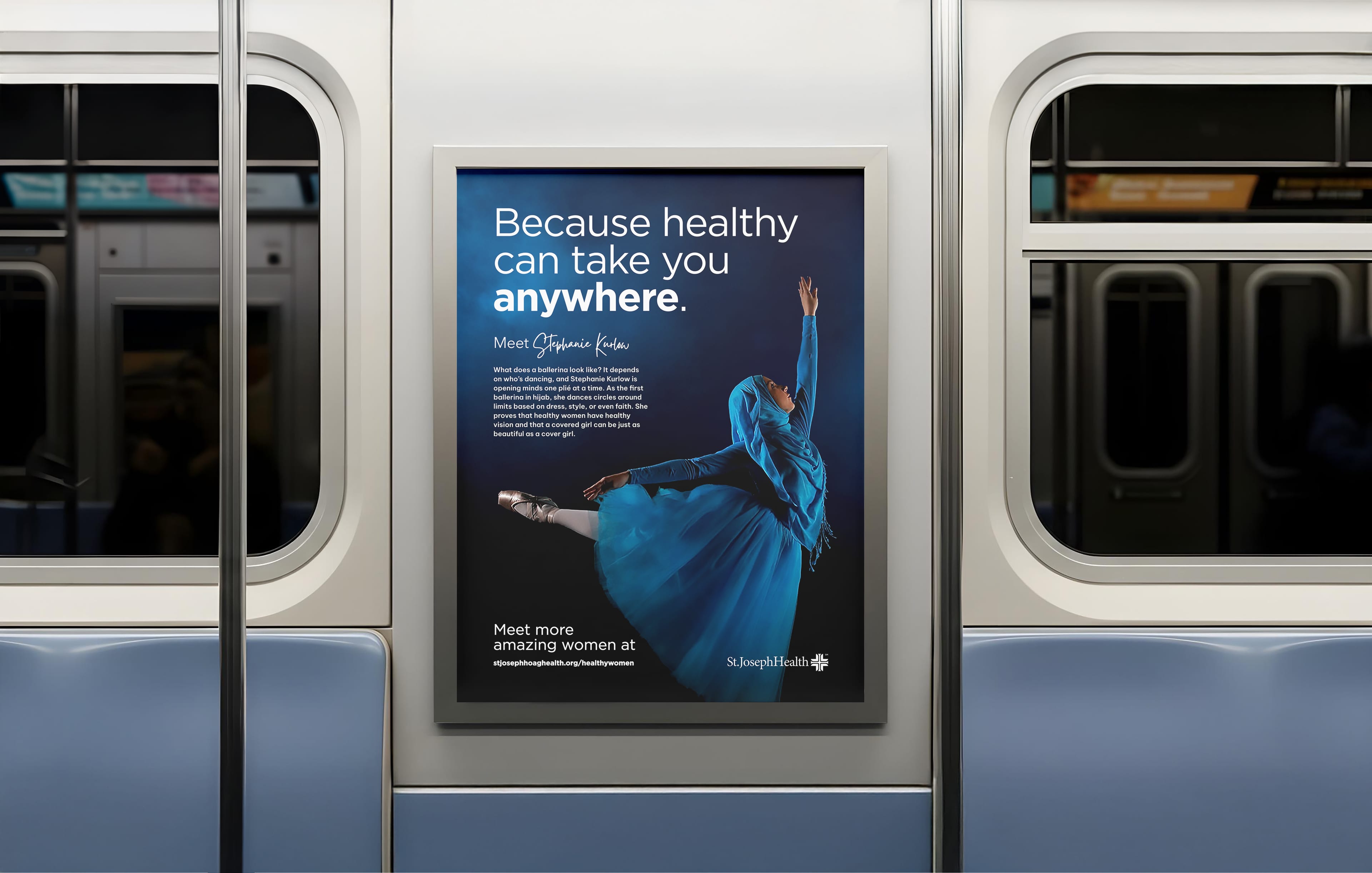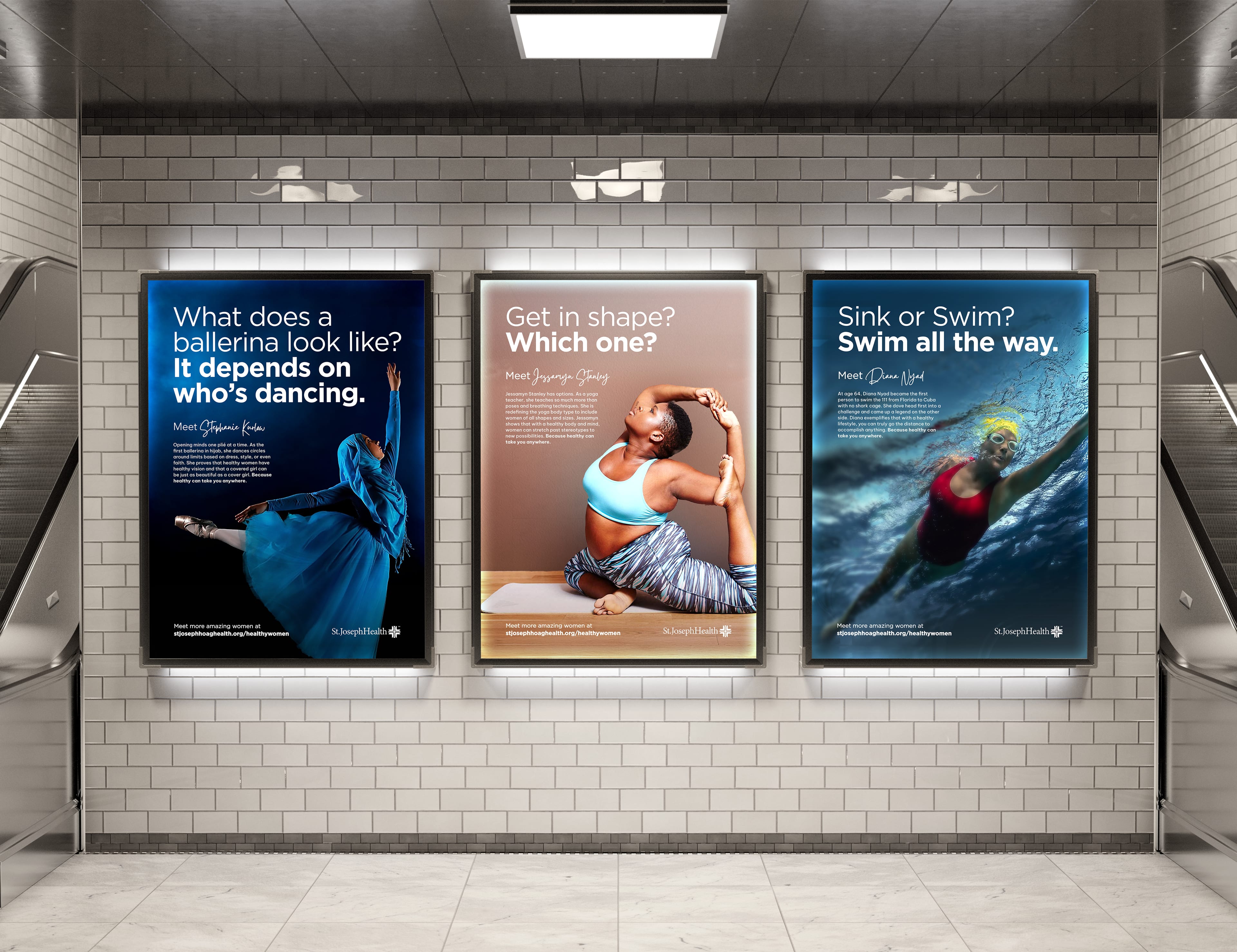 Health isn't the absence of illness, it's what enables you to follow your passions. Copywriter Janet Champ and I developed a campaign showing what happens when women prioritize their health: they're ambitious, passionate, unstoppable. Each poster featured a real woman with her own achievements, paired with the tagline "Because healthy can take you anywhere." I art directed the visuals to feel bold and iconic, matching the strength of each woman's story.